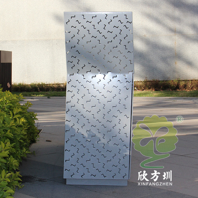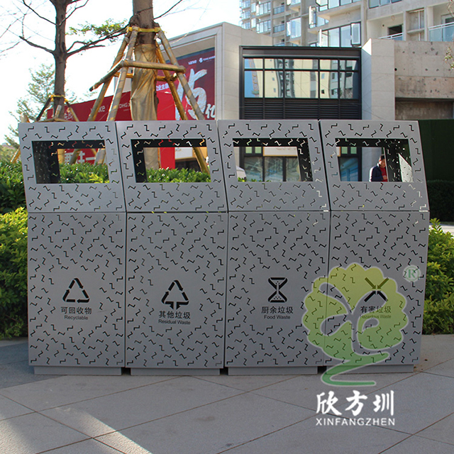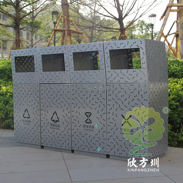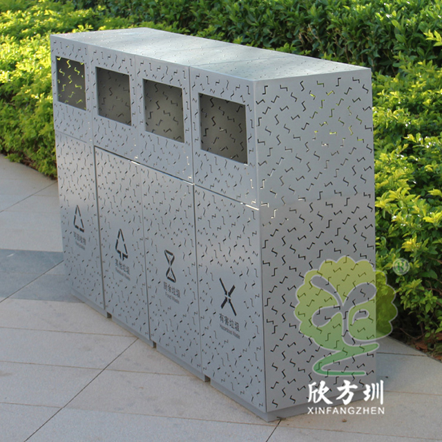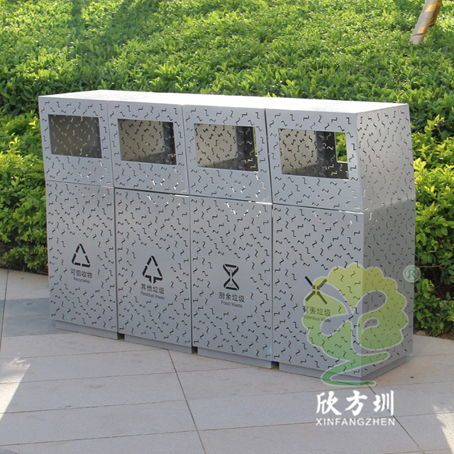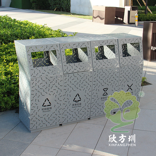 戶外鏤空組合式分類不銹鋼垃圾桶采用了201#不銹鋼板制造而成,產品型號:C1089-A,尺寸規格:260*260*900mm,戶外方形組合式四分類方形抽象設計,桶身前后左右整體采用Z形鏤空有效散發桶內異味,正面鏤空國家最新的分類標識,背后三角鑰匙可以取出內置的鍍鋅板內筒,這款垃圾桶是廣東深圳前海合作區定制的,還定制了鏤空Z字鏤空的休閑椅配套使用。