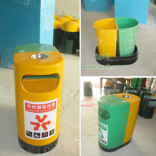 ? 深圳寶安沙井實驗學校,是深圳垃圾桶的老顧客了。按照之前訂購的玻璃鋼垃圾桶樣板生產,發實物照給工廠的廠長確認。A21玻璃鋼環保分類垃圾桶的規格為:680*400*850mm.這款垃圾桶來頭可不小哦,它是獲得了專利外觀設計的玻璃鋼垃圾桶。每個產品是經過的嚴格生產程序制造出來,貼上產品合格證,符合企業高品質標準。玻璃鋼垃圾桶一邊嫩綠,一邊中絡黃,底座黑色,外加一個煙灰缸巧妙的搭配,簡潔、美觀。桶蓋/桶身采用FRP玻璃鋼復合材料制造,具有防腐、防盜、防生銹、易清潔等特點,表面涂層采用高分子耐老化膠衣涂層,色澤明快、持久。