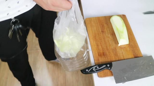? ? 我們找一個食物我們切一下我們看一下效果如何?大家看一下壞掉的菜我們就直接把它削掉了不要了,這些沒用的我們就一塊削了去,切完了沒用的菜是不是我們把它扔到垃圾桶里,或者是直接放到菜板上呢?這時沒必要了咱們準備一個垃圾袋