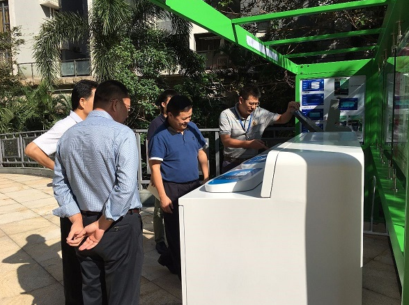 ? 彭武銘副局長及工作人員詳細介紹了鹽田區智能投放設備設置及推廣使用情況。目前鹽田區在185個小區設置了228套智能投放設備,由區城管局委托的專業公司提供設備并負責后端運輸處理。此設備為該公司第三代產品,具有自動稱重、掃描登記、語音播報、視屏監控、自動開門、收運提示等功能,市民參與投放兌換的碳幣納入鹽田區碳幣系統,可以用來兌換環保禮品。為提高居民投放準確率,每天早晚投放高峰期,小區督導員將現場指導居民進行投放。