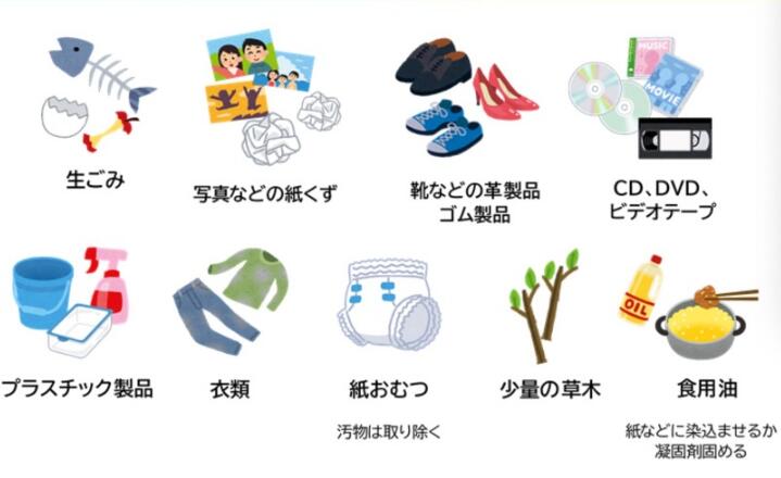 可燃垃圾有料理時(shí)產(chǎn)生的垃圾,照片紙屑,鞋子的橡膠制品的垃圾,CD磁帶等垃圾,塑料制品的垃圾,衣類垃圾,毛巾紙類垃圾,被食用油沾染的垃圾。