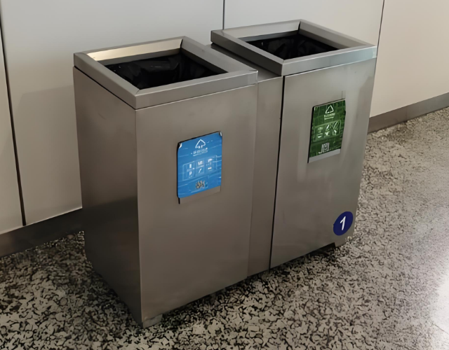 1.雙桶分區(qū):通過明確標(biāo)注“可回收物”與“其他垃圾”,引導(dǎo)乘客分類投放,助力城市垃圾分類政策的落地。部分定制方案還可增加“有害垃圾”獨立分隔倉。