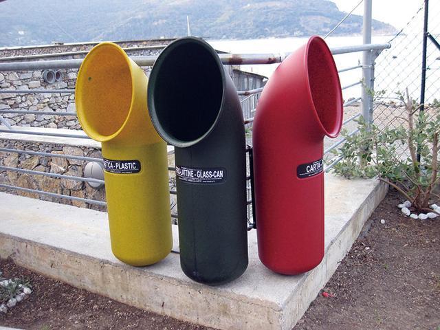 意大利韋內雷港的分類垃圾桶,黃色的盛放塑料,墨綠色的盛放玻璃,紅色的盛放紙張。