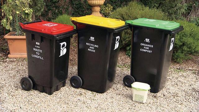 澳大利亞南部城市伯恩賽德居民區的三色垃圾桶,分別盛放普通生活垃圾、可回收垃圾和可堆肥的有機垃圾。