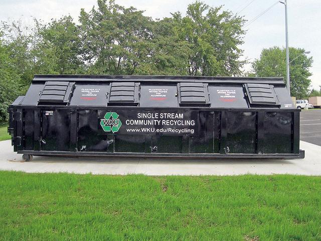 美國西肯塔基大學校園里的單流回收垃圾桶,從標志上看主要混合放紙張和錫、鋁等金屬。