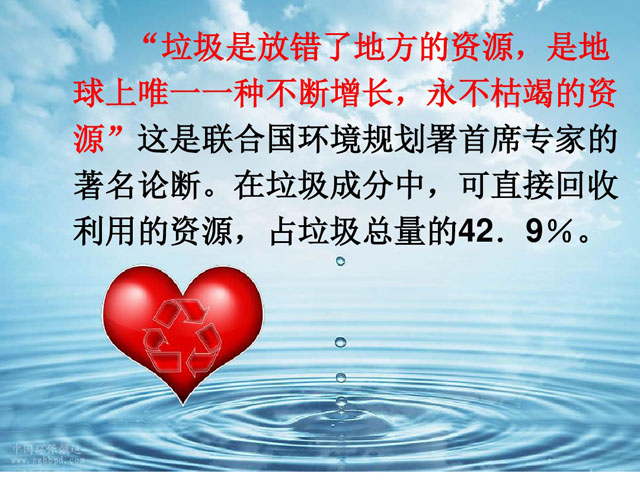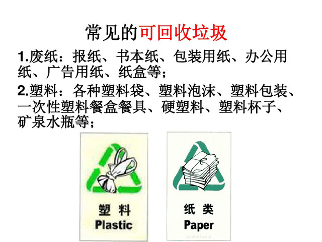 ? ? 垃圾是放錯了地方的資源,是地球上唯一一種不斷增長,永不枯竭的資源,這是聯合國環境規劃署首席專家的著名論斷。在垃圾成分中,可直接回收利用的資源占垃圾總量的42.9%。所以垃圾分類回收是一件利在千秋,功在當代的十分重要的事情。學校作為培養青少年文化素養的教育基地,培養孩子的垃圾分類意識與能力是必不可缺的,以下是分類垃圾桶網為大家收集的校園垃圾分類ppt,旨在輔助教師教育孩子,讓他們擁有社會主人翁意識,努力從自身做起,從小事做起,保護環境,節約資源。