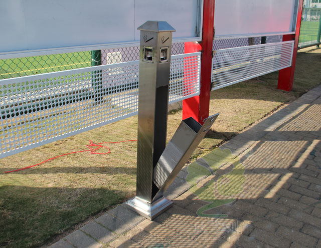C633-1廠家定制滅煙柱采用優質不銹鋼剪切、組裝、焊接、絲印而成,它包括外套管、支座、內套管、煙灰盒、底座。外套管的底端固定連接在支座上,外套管的側壁上設有煙蒂置入口,內套管用于集中收納從外套管的煙蒂置入口投入的煙蒂,內套管設在外套管的內管腔中,內內套管的開口端朝上,煙蒂置入口與內套管的開口相連通,以使得從煙蒂置入口投入的煙蒂可從內套管的開口端落入到內套管的內管腔中;