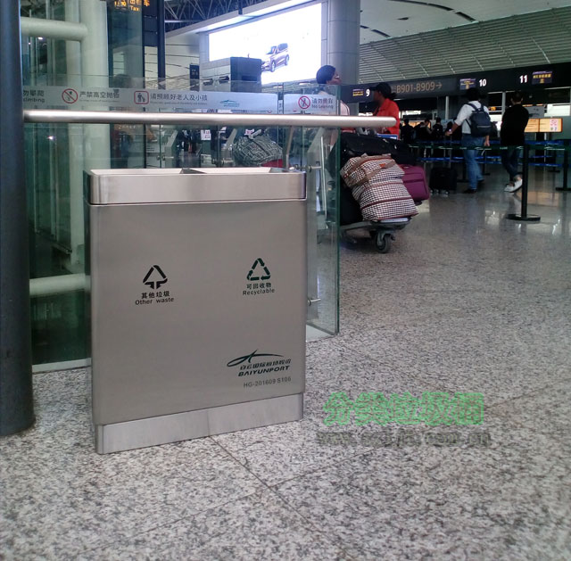 機場垃圾桶圖片:C185不銹鋼分類垃圾桶兼具功能性和美觀性,適用于機場、地鐵、高鐵等人流量巨大的場所,以下圖片是廣州白云機場安裝現場實拍以及工廠存貨拍攝。