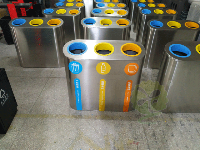 這款垃圾桶采用三分類形式,分別收集一般垃圾,瓶罐廢料,紙類廢料,瓶罐和紙類是具有重大回收價值的可回收垃圾,對它們進行分類回收,可以節約資源,保護環境,有利于國家綠色環保事業的推進。據了解,一頓塑料瓶可以可以回收0.75噸原料,一頓廢紙回收可以生產成品紙0.8噸,相當于少砍伐20棵樹齡為30年的樹木。每個人都有義務做好垃圾分類,為自己的綠色家園做出點點滴滴的貢獻。