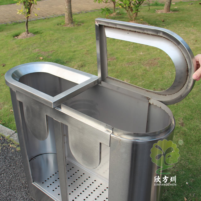 室內地鐵站分類不銹鋼垃圾桶工藝精湛,品質高檔,深受客戶好評。它采用優質不銹鋼板作為原材料,制作出來的垃圾桶堅固耐用,光滑不生銹。整個垃圾桶制作非常注重人性化的小細節,表角都作了折彎處理,沒有利角不割手,防止意外割傷。