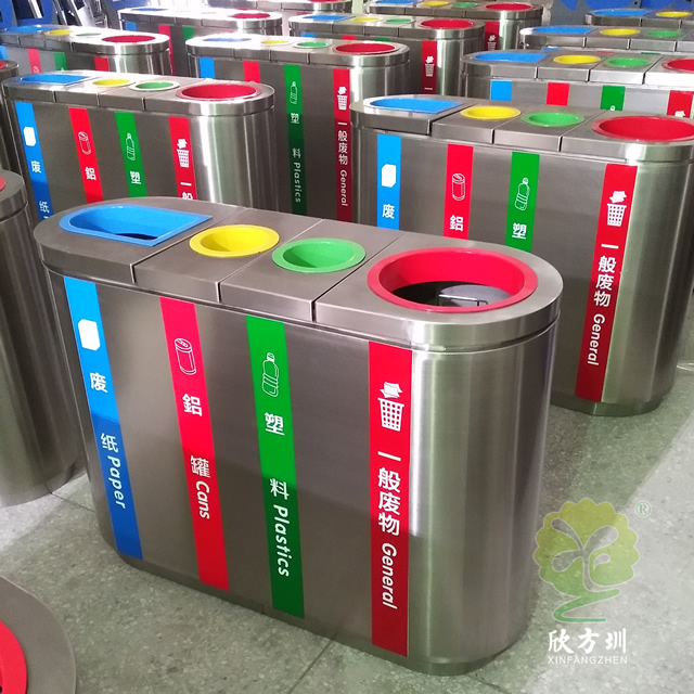 室內立式四分類不銹鋼垃圾桶是欣方圳設計生產的一款經典熱銷垃圾桶,這款垃圾桶雖然使用不銹鋼制作而成,但是外形分類標識采用了貼紙設計,使其看起來有一股自然不銹鋼本色,特別適合各種購物商城、國際機場、室內車站、地鐵站等場景使用。這款垃圾桶外表經過防腐工藝處理,防水防腐蝕、經久耐用、工藝精湛、物美價廉。如果你對這款垃圾桶感興趣,請直接聯系我們報價。