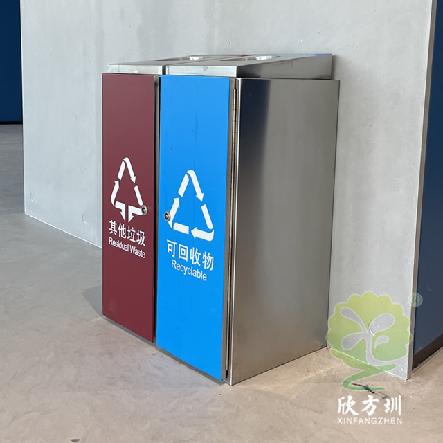 室內直投口方形連體不銹鋼分類垃圾桶是深圳市龍華區文化廣電旅游體育局的一位采購在我們工廠定做一款桶,外桶材質采用了201#不銹鋼板制造,方形桶圓形直投口設計,可以組合式擺放兩分類或者三分類四分類,垃圾桶門板采用四色圖紙擁有國標最新分類標識,門板三角鑰匙可開門取出內置的內膽。