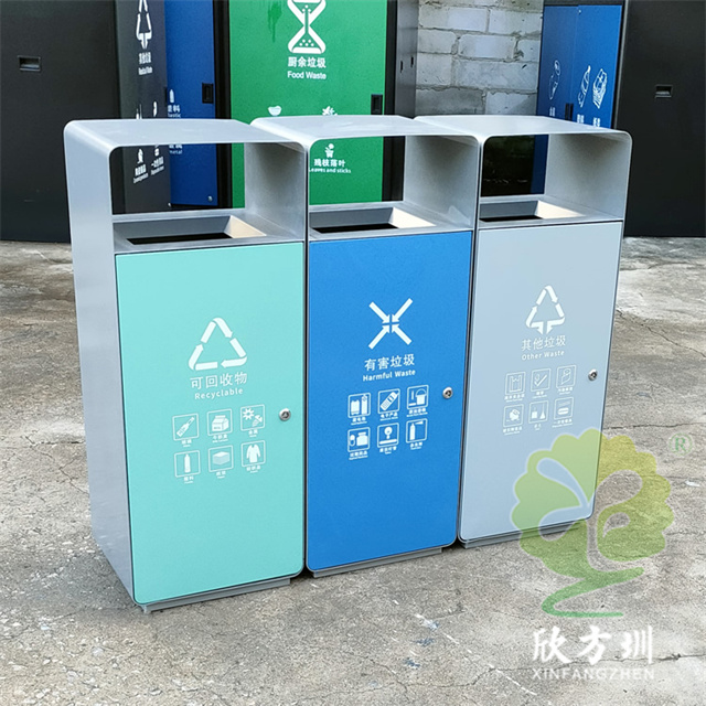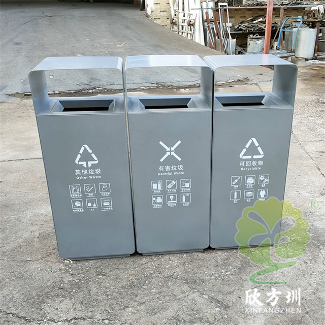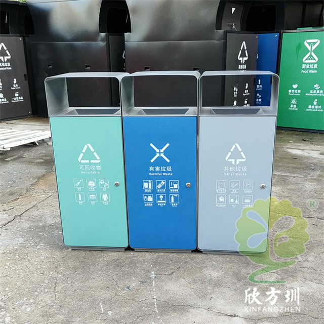 室外加厚組合三色不銹鋼分類果皮箱使用了201#不銹鋼板制作,外部框架采用了2.5mm厚,桶身采用了1.0mm厚的不銹鋼板裁剪折彎制造,單筒雙面側面投口方形設計,可以任意自由組合分類,外部框架噴塑灰色,門板正反面噴塑了不同的顏色,可回收物噴塑淡藍色、有害垃圾噴塑天藍色、其他垃圾噴塑了淡灰色,可以組合制作兩分類、四分類、五分類。
