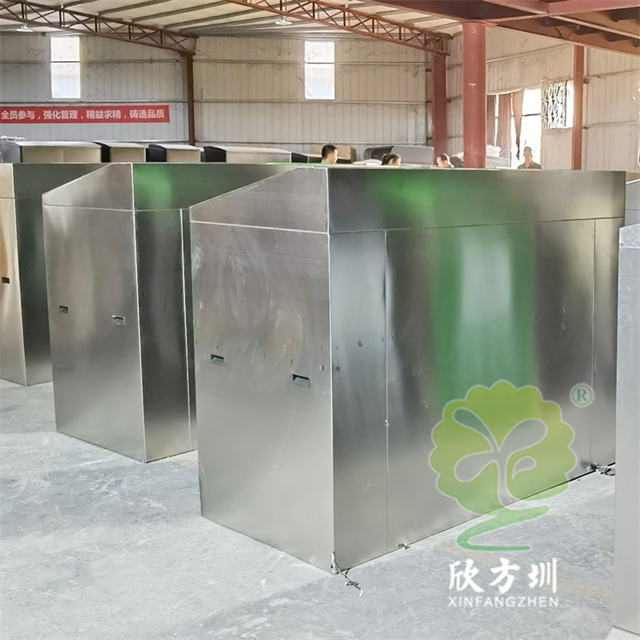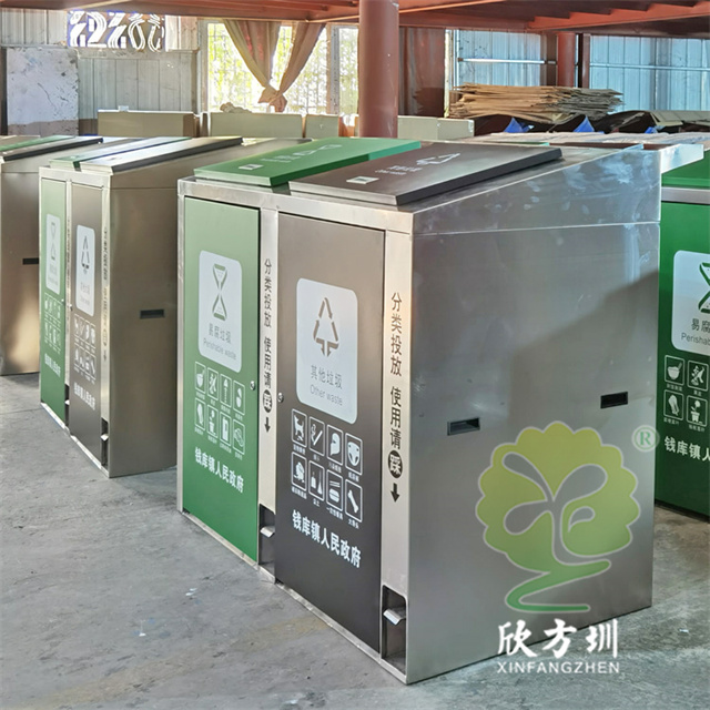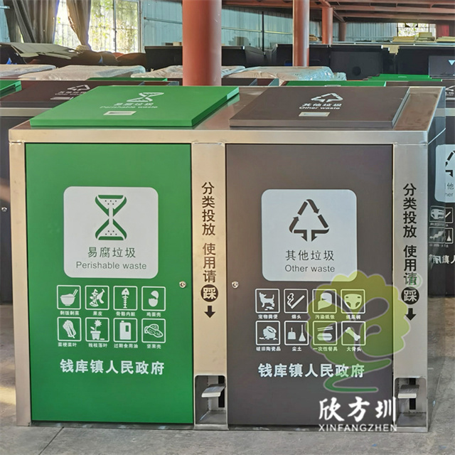 戶外小區腳踏式兩連體不銹鋼垃圾桶桶身優質201#不銹鋼足0.95mm厚度的板生產,框架不銹鋼本色,易腐垃圾門板和蓋子噴塑綠色,其他垃圾門板和蓋子噴塑黑色,蓋子帶嵌入式扣手,兩連體分類方形設計帶腳踏式,門板采用白色的油墨絲印了最新國標分類標識,腳踏式上方絲印了黑色文字指引。