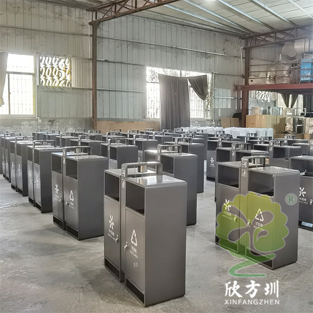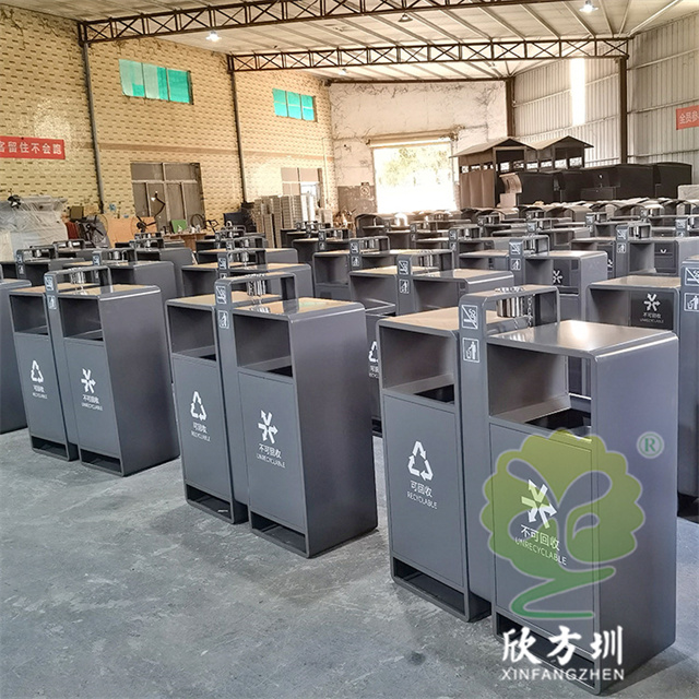 戶外小區(qū)烤漆兩分類不銹鋼垃圾桶材質(zhì)采用了201不銹鋼板1.0毫米厚的,這款垃圾桶想節(jié)約成本也可以采用鍍鋅板以及熱軋鋼板制造,但是會(huì)縮短使用壽命,外觀方形兩連體設(shè)計(jì),表面噴涂噴塑上了一層灰色的的外衣俗稱烤漆,正反面油墨絲印了可回收和不可回收的分類標(biāo)識,頂部中心位置帶一個(gè)煙灰盅,門板帶三角鑰匙可開門取出內(nèi)置的內(nèi)筒。