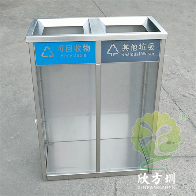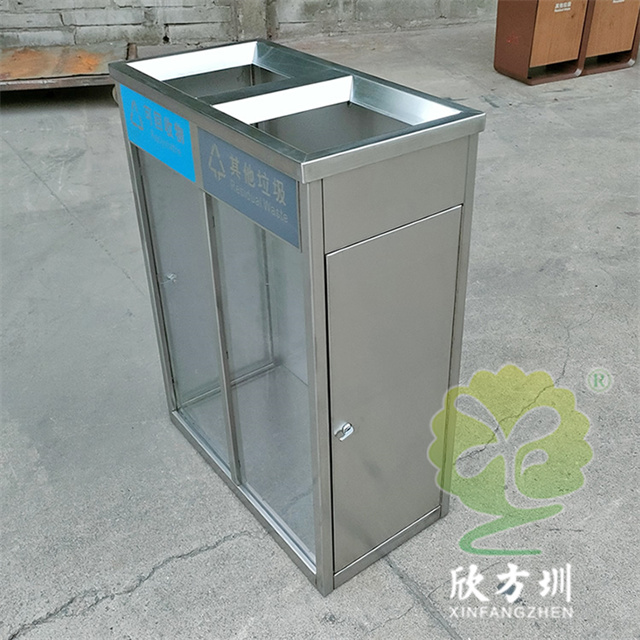 室內兩連體防爆透明不銹鋼分類垃圾桶整體材質采用了1.5mm厚(足1.42mm)生產,直投口立式方形兩連體分類設計,表面不銹鋼本色啞光,正面上方橫條油墨絲印可回收物和其他垃圾國標分類標識,左右兩邊使用了扭鎖方便取出垃圾袋,無需要內筒直接套塑料透明垃圾袋使用,桶底部加四個腳膠墊這樣有效避免挪動發出聲響。