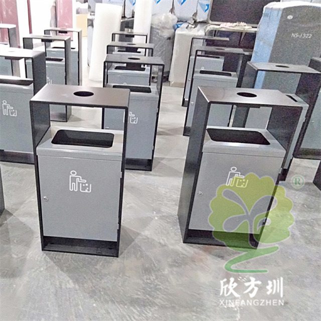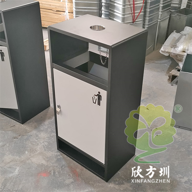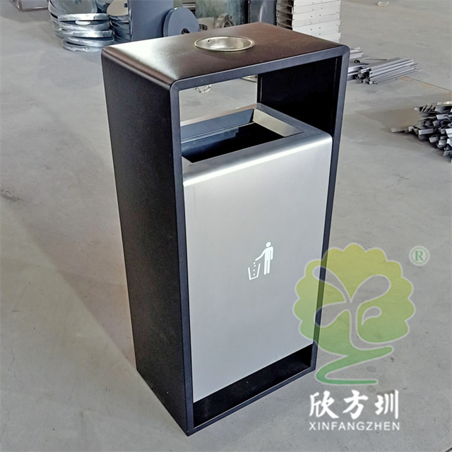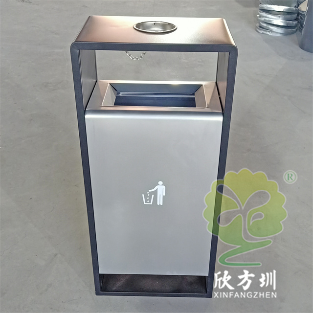 戶外小區簡易方形噴塑不銹鋼垃圾桶可以選用不銹鋼或者鍍鋅板制作,這款果皮箱框架噴涂黑色塑粉桶身噴塑銀色,表面可以根據用戶要求定制,頂部中心位置帶圓形的煙灰盅,投口帶折邊,桶身離地面比較高也有效避免雨水進入,可以絲印logo人頭標或分類標識。