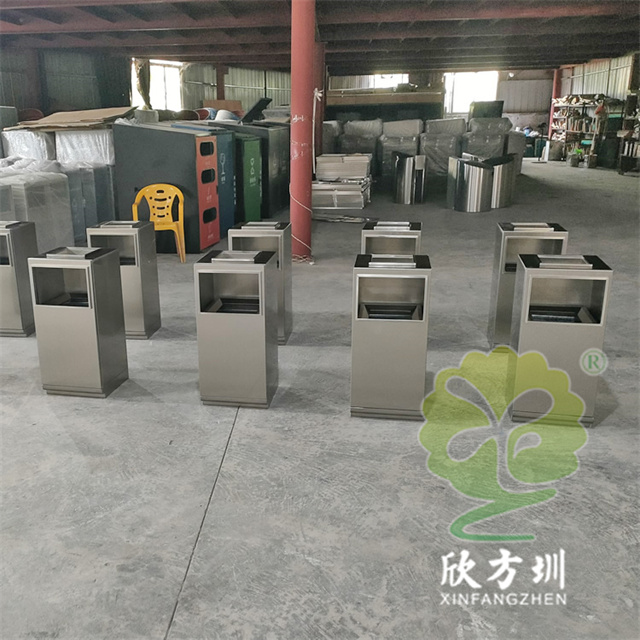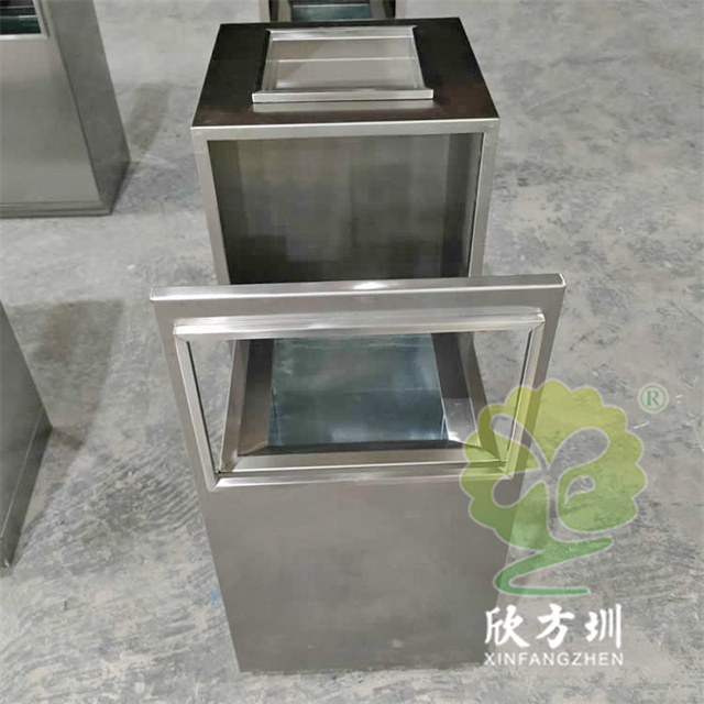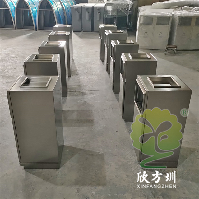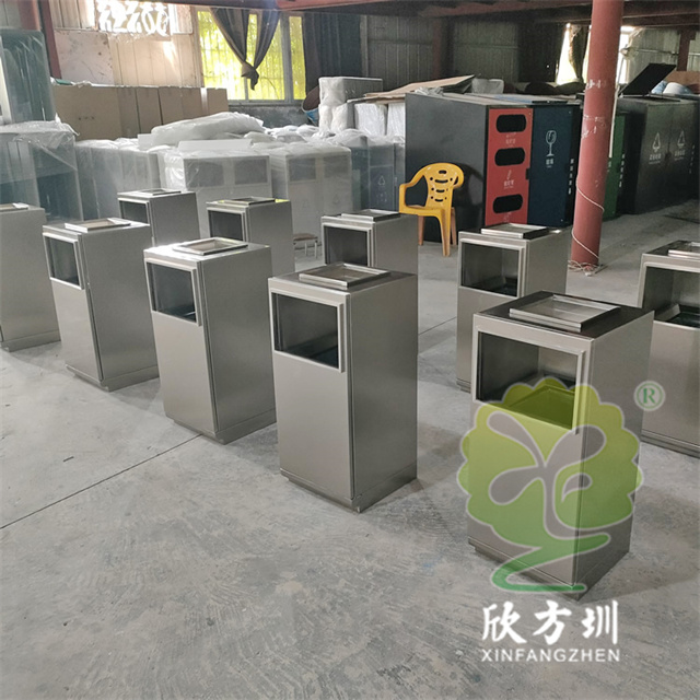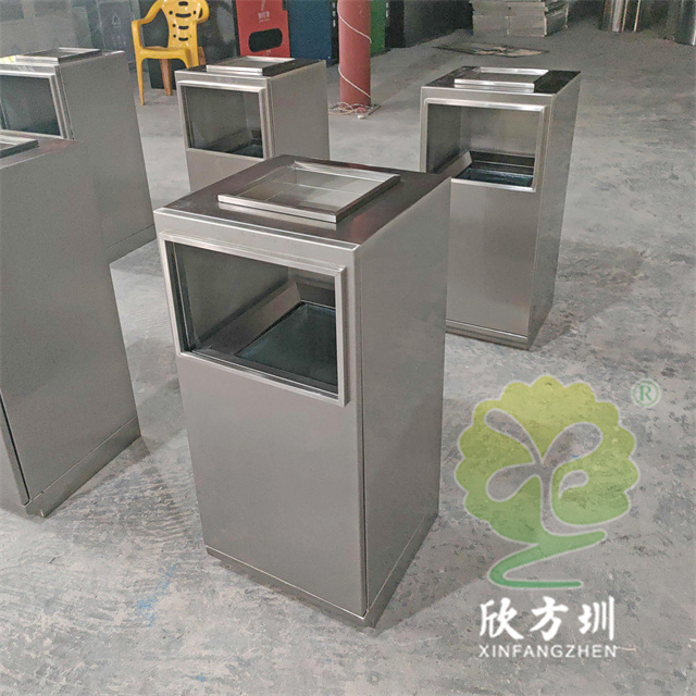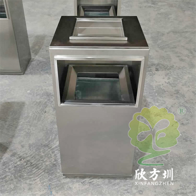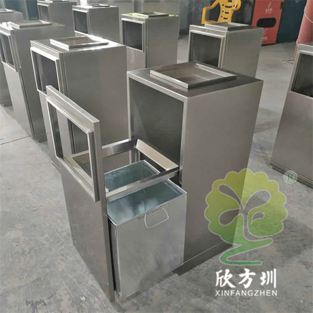 防指紋封油抽拉組合式不銹鋼分類垃圾桶可以使用201或304不銹鋼板制造,方形滑軌抽拉式組合式設計,表面做了無指紋封油處理,投口方形折邊有效防止割手,頂部位置帶煙灰盅,不需要也可以不要煙灰盅,正面可以絲印分類標識以及企業logo。