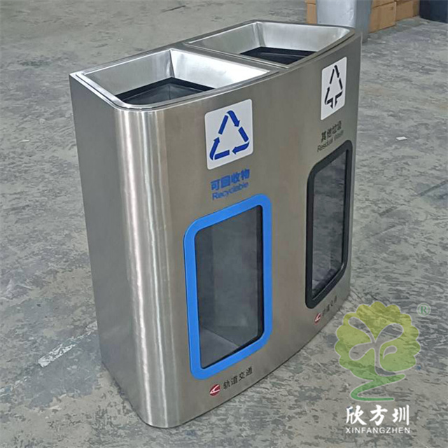 加厚地鐵站軌道交通不銹鋼分類垃圾桶,兩連體直投口設計,外筒304不銹鋼2.0mm,內筒304不銹鋼1.0mm厚度,絲網印刷分類標識和軌道交通logo,透明位置可以采用亞克力板或者鋼化玻璃,亞克力板膠條封邊。