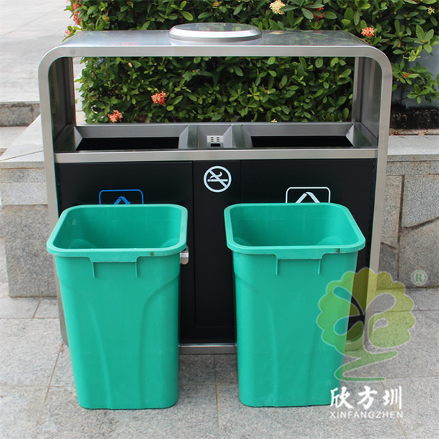 戶外市政街道不銹鋼分類垃圾桶可以采用201不銹鋼或者304不銹鋼板制造,頂部中心位置凸起出是這款桶創意方形兩連體設計,正反面油墨絲網印刷最新國標分類標識和禁煙標識,側面可以定制絲印企業logo,垃圾桶兩個方形投口中間位置帶滅煙盒,帶三角鑰匙開門方便環衛工人清理內置廢物。