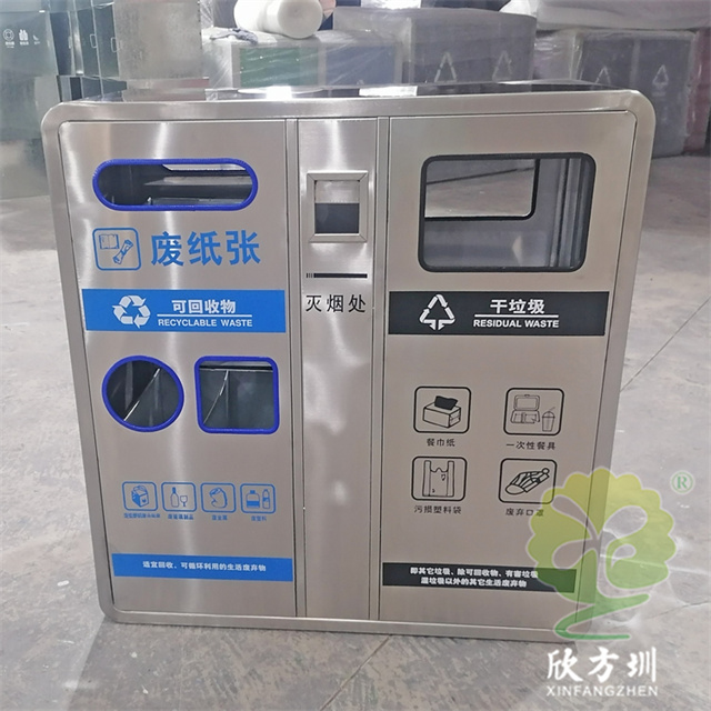 戶外大容量城市街道不銹鋼分類垃圾桶可以采用201/304不銹鋼板制造,表面烤漆噴塑了就可以做鍍鋅板材質的,雙面可回收物多個投口設計,有長方形廢報紙、方形投口、圓形塑料瓶投口,方形干垃圾投口,投口膠條封邊防止割手,中間位置帶滅煙盒,投口顏色可以定制。