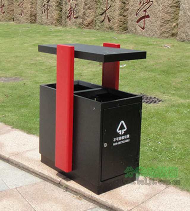 這批垃圾桶規格是750*470*940mm,采用優質冷軋鋼經沖床沖孔、表面經過除油、噴砂防銹處理后,再進行酸洗磷化處理;表面清理干燥后整體進行烤漆處理,桶身為黑色,立柱暗紅色,絲印白色分類標識;表面磨砂烤漆,啞光效果。有耐火安全,抗高低溫,堅固耐用,不易破損、經久耐用的特點,廣泛應用于工業園、學校等場所。