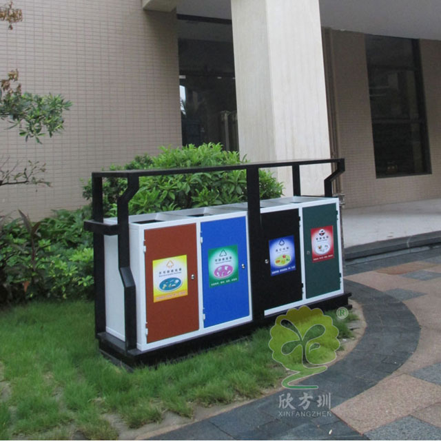 物業小區鋼板四分類垃圾箱采用優質冷軋鋼材料經激光切割剪鈑下料、折彎、沖壓、焊接、打磨、等工藝:表面經過除油、噴砂防銹處理后,再進行酸洗磷化處理;表面清理干燥后整體進行靜電噴涂或烤漆處理,靜電噴涂是經過流水線高溫固化爐固化后再出爐冷卻,加工后的塑粉附著力強,不易剝落,這樣戶外防銹效果才會好。