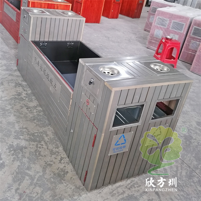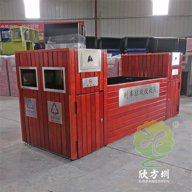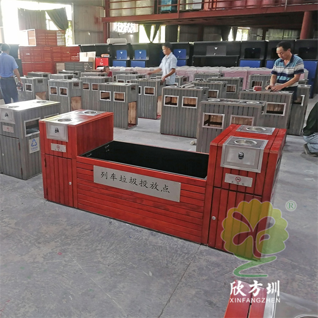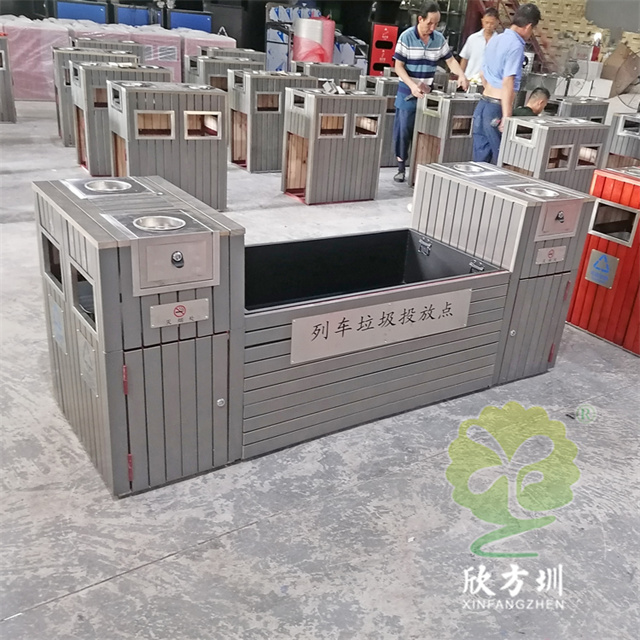 高鐵站連體組合鋼木分類垃圾桶是青海一位顧客在我們工廠定制的,這款垃圾桶設計比較特殊是兩個兩連體的垃圾桶加一個方形的列車垃圾投放處組合擺放,采用了防腐木加不銹鋼及冷軋鋼板制作而成,用戶定制了兩張不同顏色的防腐木條,中間這個投放處方便列車員扔廢物,旁邊兩個垃圾桶方便旅客扔垃圾及抽煙使用,頂部配備了4個滅煙盒。